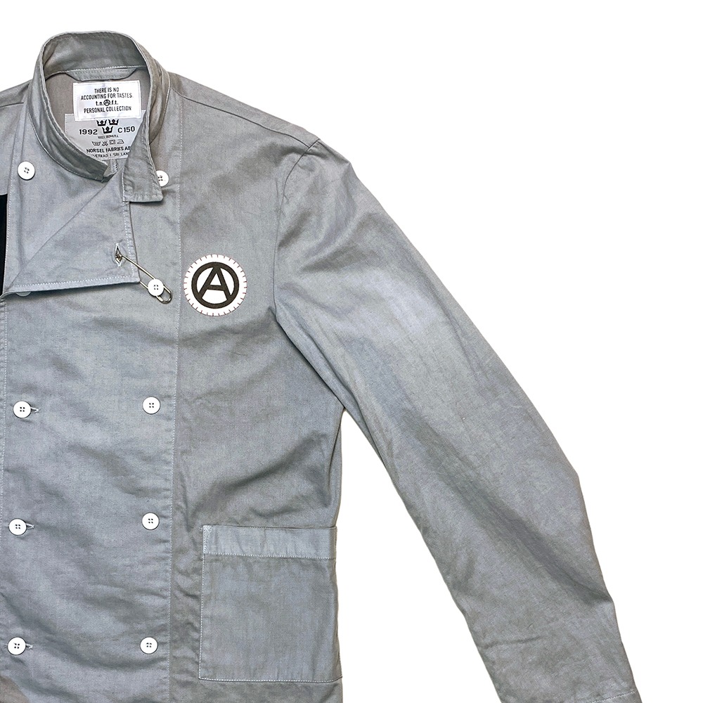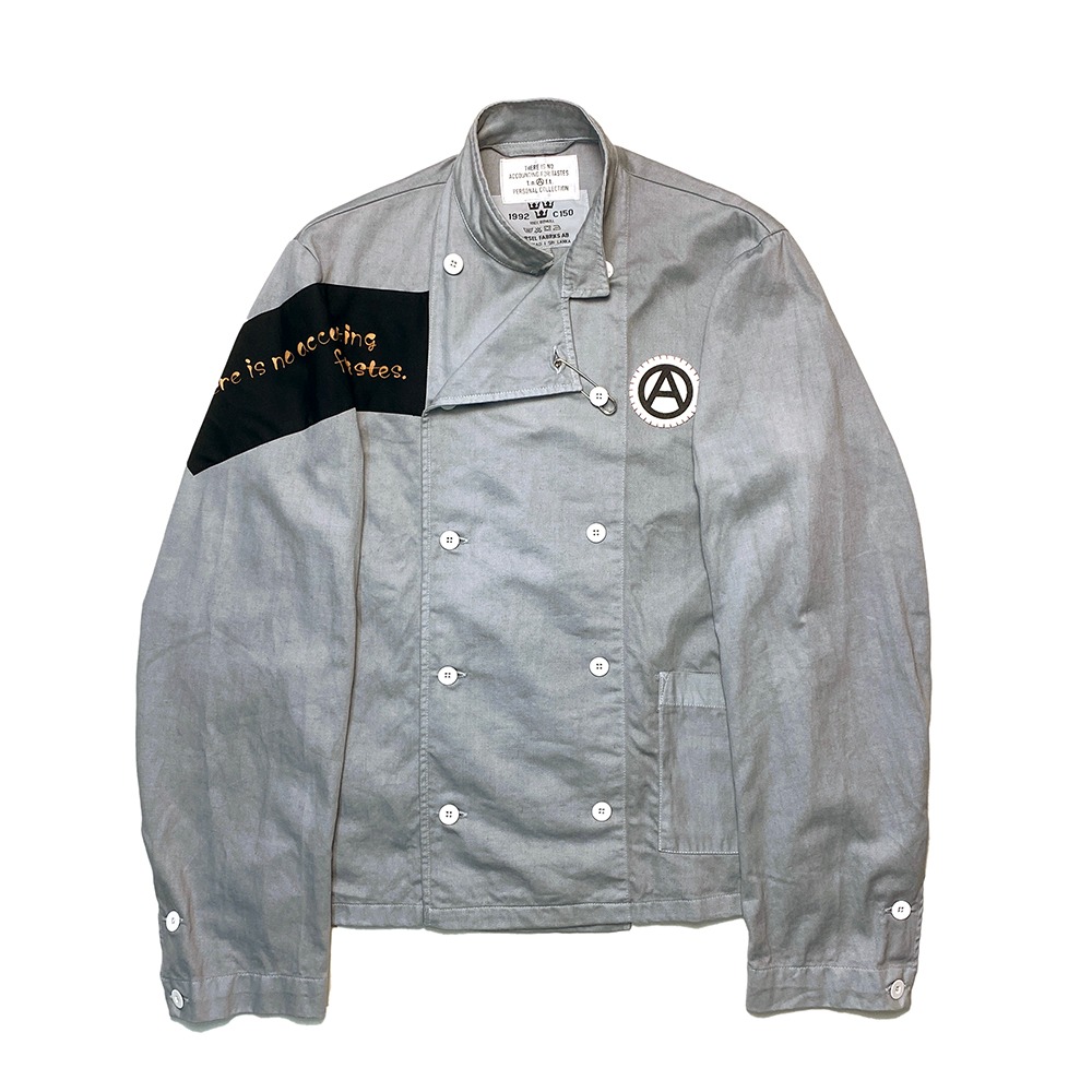 ジャケットは淡いグレーに染め直し、ブランドスローガンである「There is no accounting for tastes.」のパッチを右に。