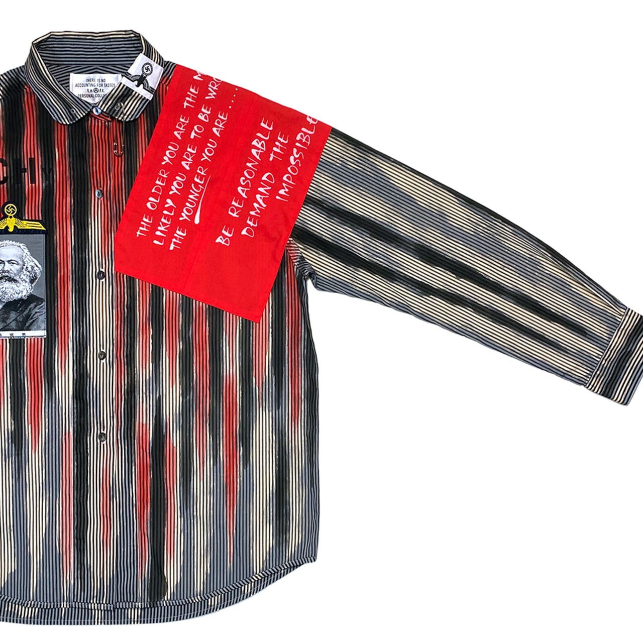 また、アナーキーシャツを作る上で非常に重要なパーツである「スローガンパッチ」は一枚一枚手描きにて制作、「馬克思パッチ」もプリントではなく、t.n.A.f.t.製の「織りパッチ」を使用しております。