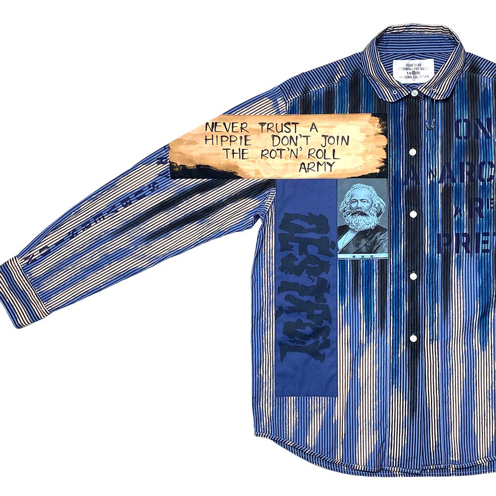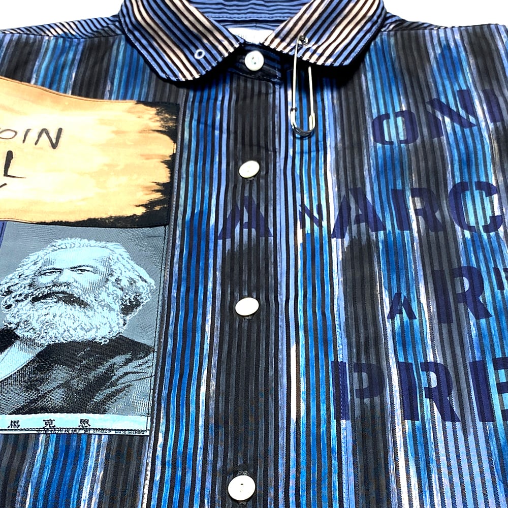 また、アナーキーシャツを作る上で非常に重要なパーツである「スローガンパッチ」は一枚一枚手描きにて制作、「馬克思パッチ」もプリントではなく、t.n.A.f.t.製の「織りパッチ」を使用しております。