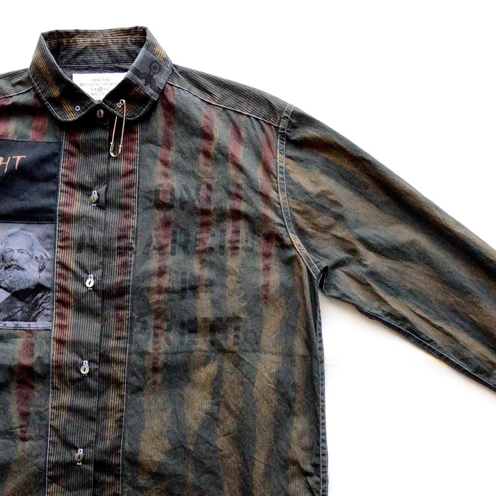 こちらのアナーキーシャツは三度染め加工という特別仕様、当然「マルクスパッチ」もプリントではなく、t.n.A.f.t.製の「織りパッチ」を染めて使用しております。