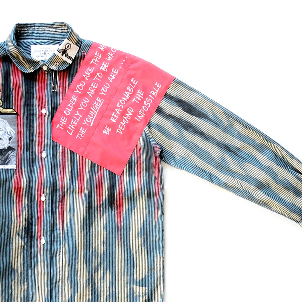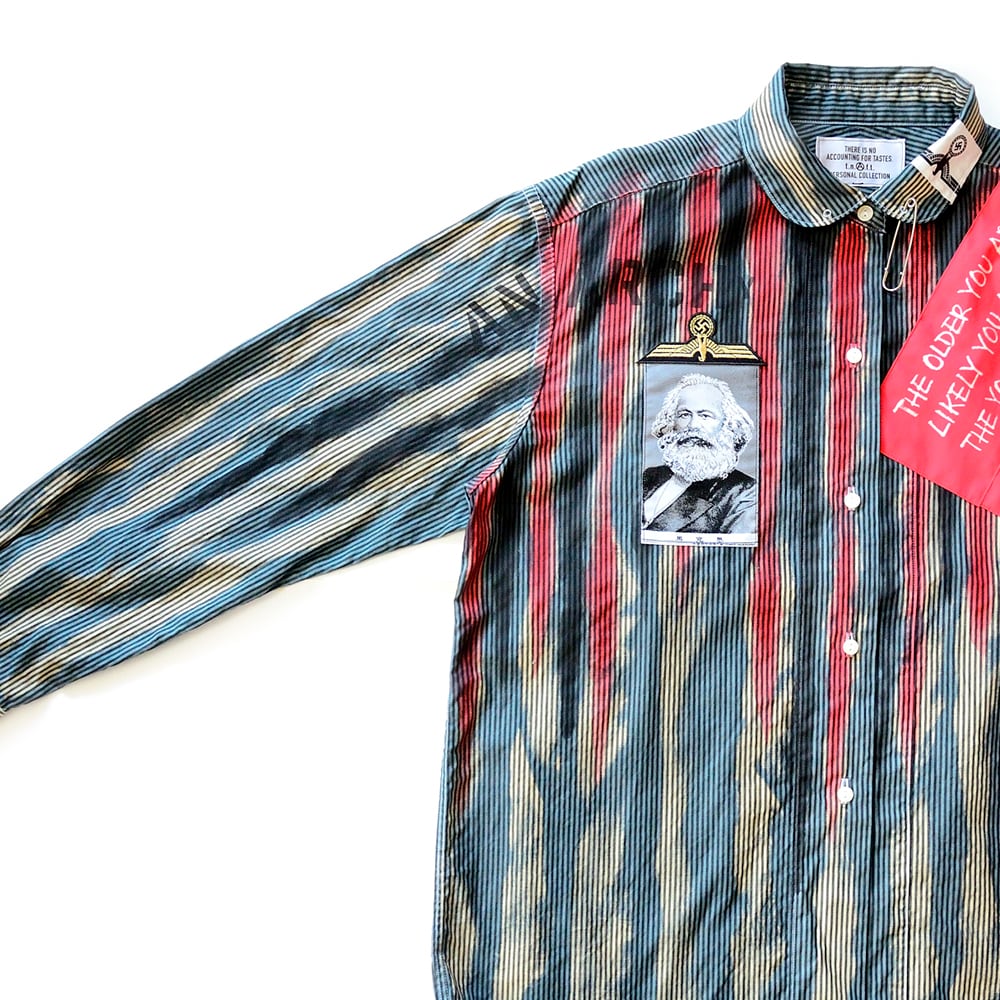 こちらのアナーキーシャツは「墨汁染」によるスローガンパッチに加え、二度染め加工という特別仕様、「マルクスパッチ」もプリントではなく、t.n.A.f.t.製の「ジャガード織りのパッチ」を使用しております。